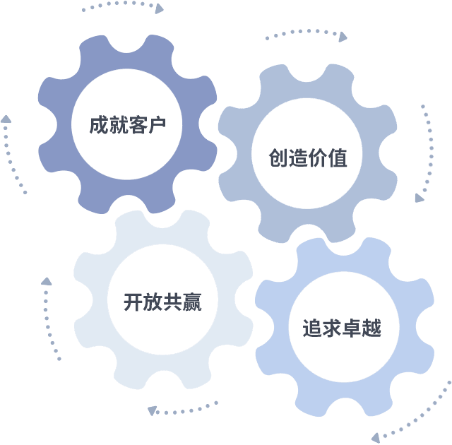 成就客户是一切决策的出发点,,,创造价值是衡量所有工作的标准,,追求卓越是我们做事做人的态度,,,,开放共赢是我们的格局也是最终的结果。。价值观的齿轮环环相扣,,,推动着组织里的每个人不断向前。。。。